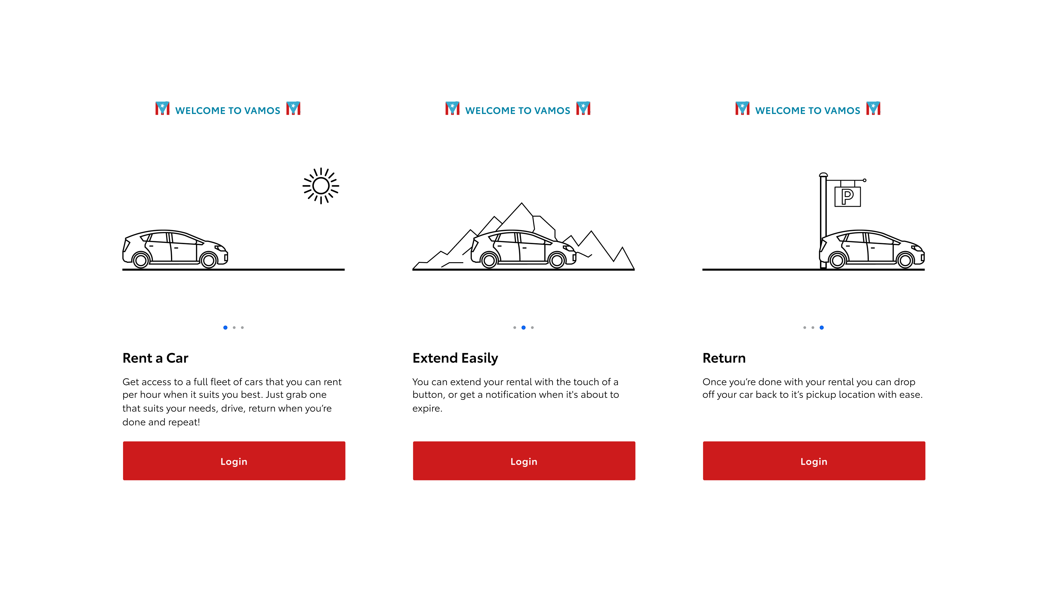 New users are guided through a short, swipeable walkthrough that explains how Vamos works, from account setup to finding and booking a car in minutes.